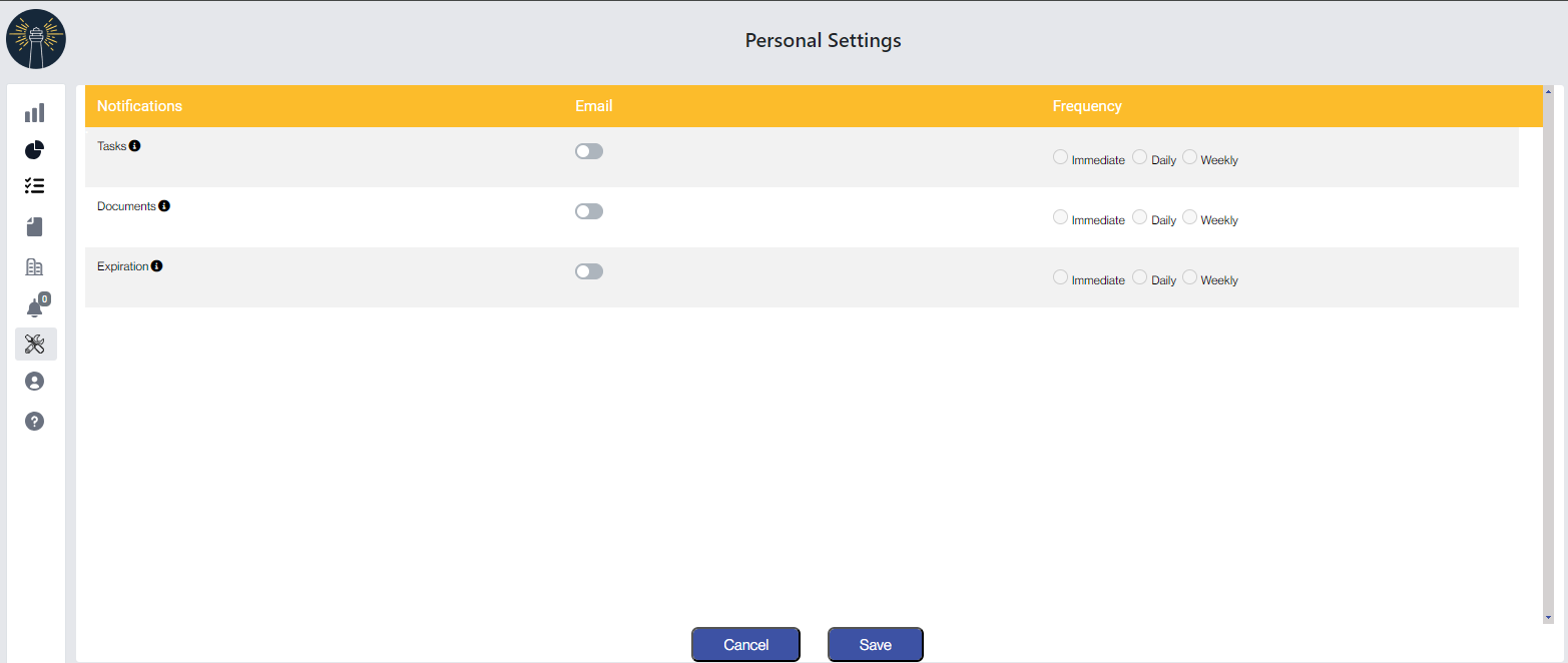 For added convenience, you can enable email notifications for tasks and documents. Simply go to the User Profile section at the bottom of the sidebar and select Personal Settings. Here, choose a desired frequency (i.e., Immediate, Daily or Weekly) for each Notification.
