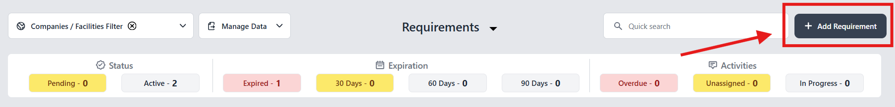 - To add a new Requirement/License into the system, first navigate to the Management module. Then, click the "+ Add Requirement" button in the upper right corner.